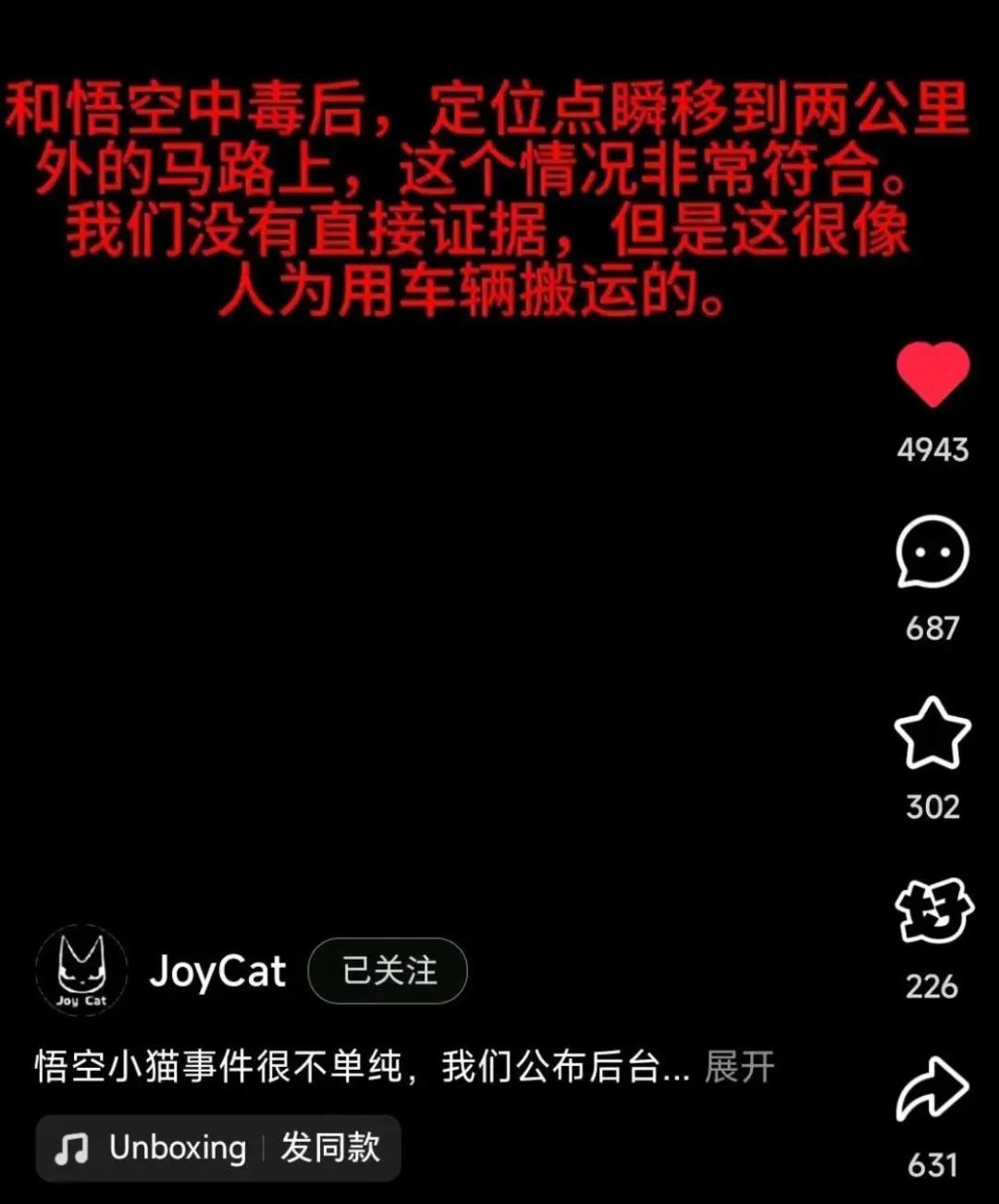 出事前,悟空一直很活泼地在运动,可是出事后轨迹特别直,二十分钟后,突然出现在两公里外的车道上。