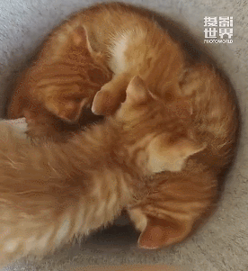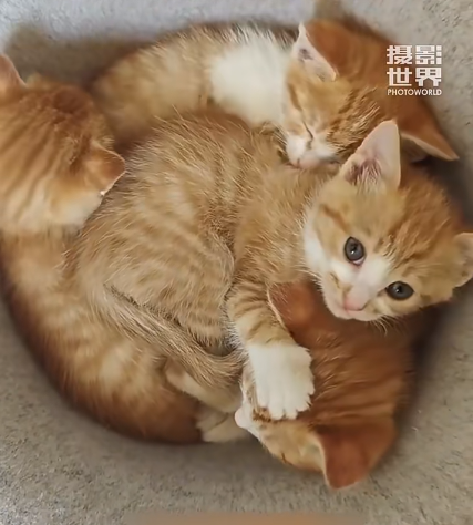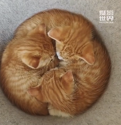 只见3只小奶橘团在一个窝睡觉,还都统一成顺时针方向。