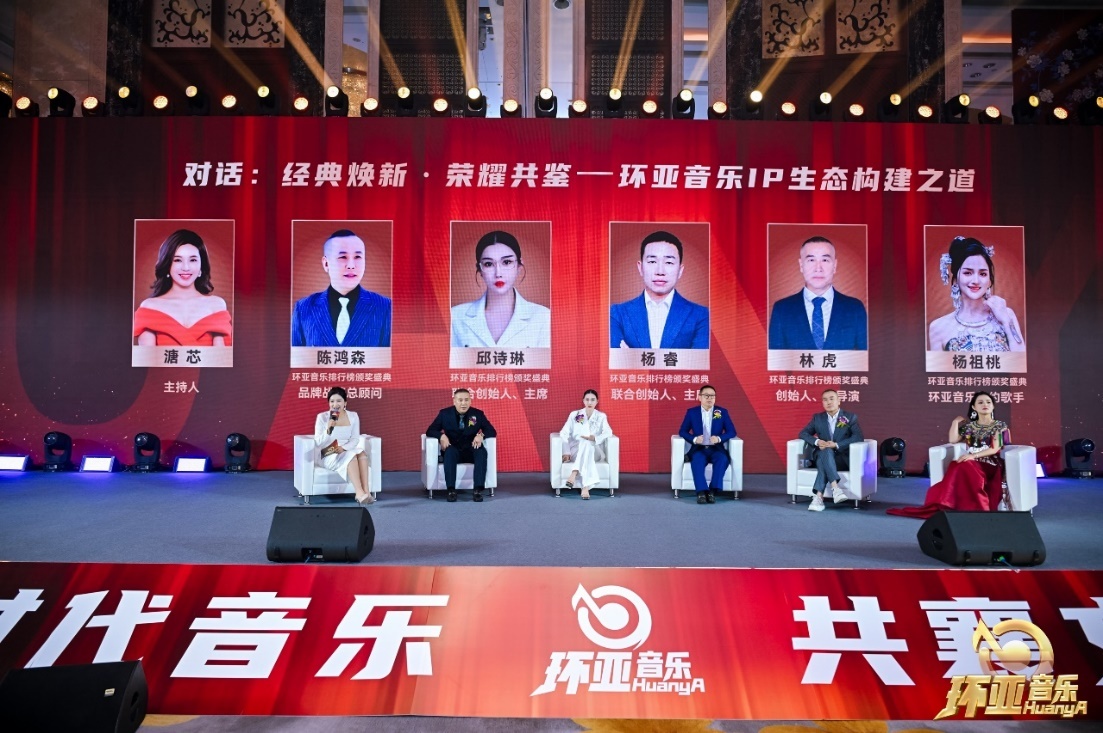 对话环节:环亚音乐品牌战略总顾问陈鸿森、联合创始人邱诗林、杨睿、创始人林虎及签约歌手杨祖桃围坐一堂,以"经典焕新·荣耀共鉴"为主题,展开了一场关于音乐IP生态构建的深度对话。这场汇聚产业领袖与新生代音乐人的思想碰撞,为现场观众呈现了环亚音乐在IP生态建设上的战略布局与创新思考。