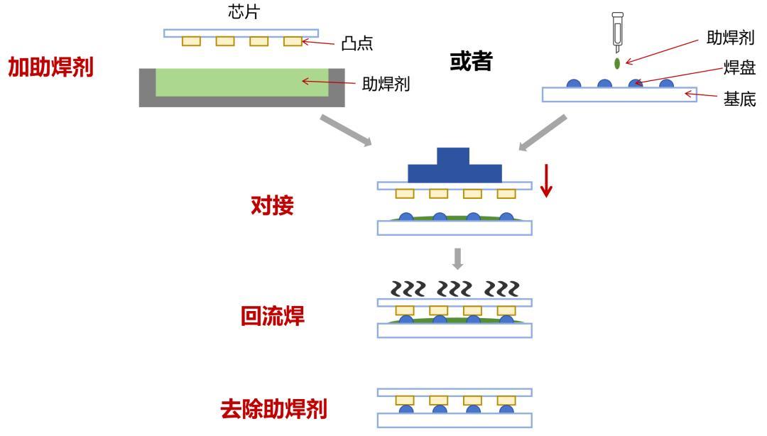 先将晶粒(芯片)的凸点沾上助焊剂,或者在基板上加定量的助焊剂。助焊剂的作用,是去除金属表面氧化物并促进焊料流动。