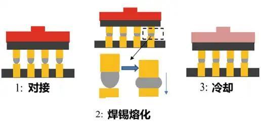 通过加热,让熔融的凸点与基板焊盘相结合,实现晶粒与基板的结合。