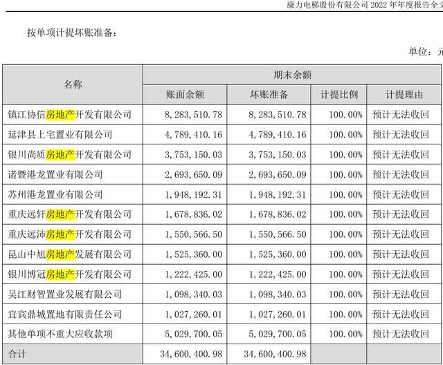 康力电梯2022年应收账款中,按单项计提坏账准备的金额合计约3460.04万元,其中大部分为房地产开发公司,到了2023年,该项坏账准备金额大幅增加到2.03亿元。截至2024年末,则进一步增加至2.14亿元。