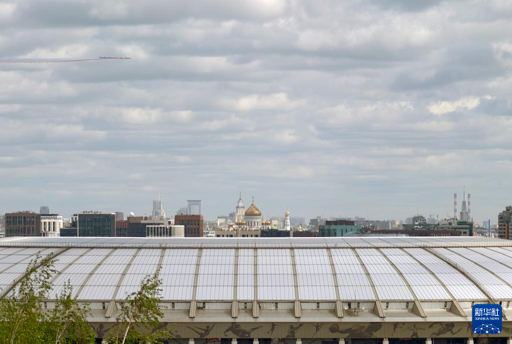 5月5日,在俄罗斯首都莫斯科,参加阅兵式彩排的战机编队在市中心上空飞过。