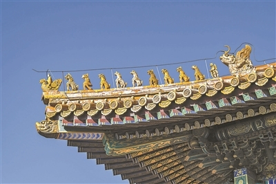 古代建筑的脊兽数量严格遵循等级制度,数量越多,建筑等级越高。屋脊兽的数量通常为单数,如3、5、7、9,最多不超过9个:普通建筑可能仅有1—3个脊兽;王府、寺庙通常为5—7个;故宫主要宫殿一般为9个(如乾清宫、坤宁宫);而太和殿的屋脊数量则达到了10个,分别是龙、凤、狮子、天马、海马、狻猊、狎鱼、獬豸、斗牛、行什。这不仅预示着皇权至上,还说明只有皇帝才配享受到“十全十美”的待遇。至于太和殿上为什么是十个屋脊兽,其实还隐藏着一个小故事。