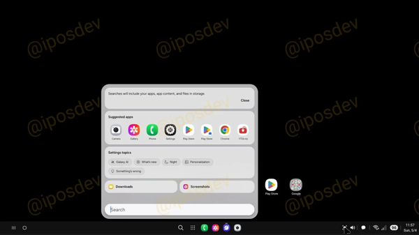 One UI 8中DeX模式的主要变化包括:任务栏上的应用图标现在居于屏幕底部中央,与以往靠左对齐的布局不同;状态栏图标也变得更加纤细,位于屏幕右侧。桌面窗口功能允许用户像在PC上一样调整窗口大小并同时运行多个应用程序。应用抽屉以紧凑形式弹出,卡片式的搜索栏可以扫描应用、文件和设置,同时通过三星文件管理和图库提供下载文件和截图的快捷方式。快速设置面板被放置在屏幕右下角,整体设计也更加精致。