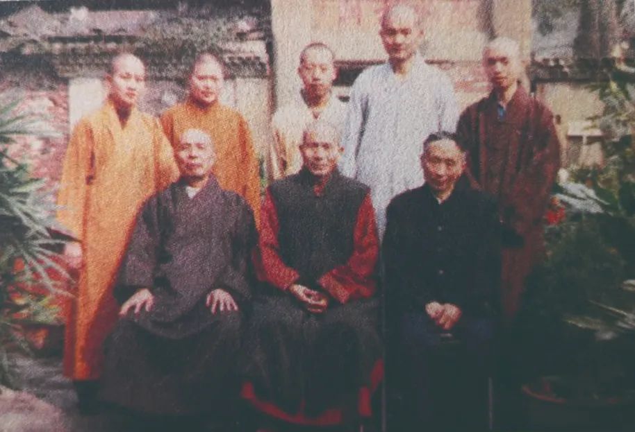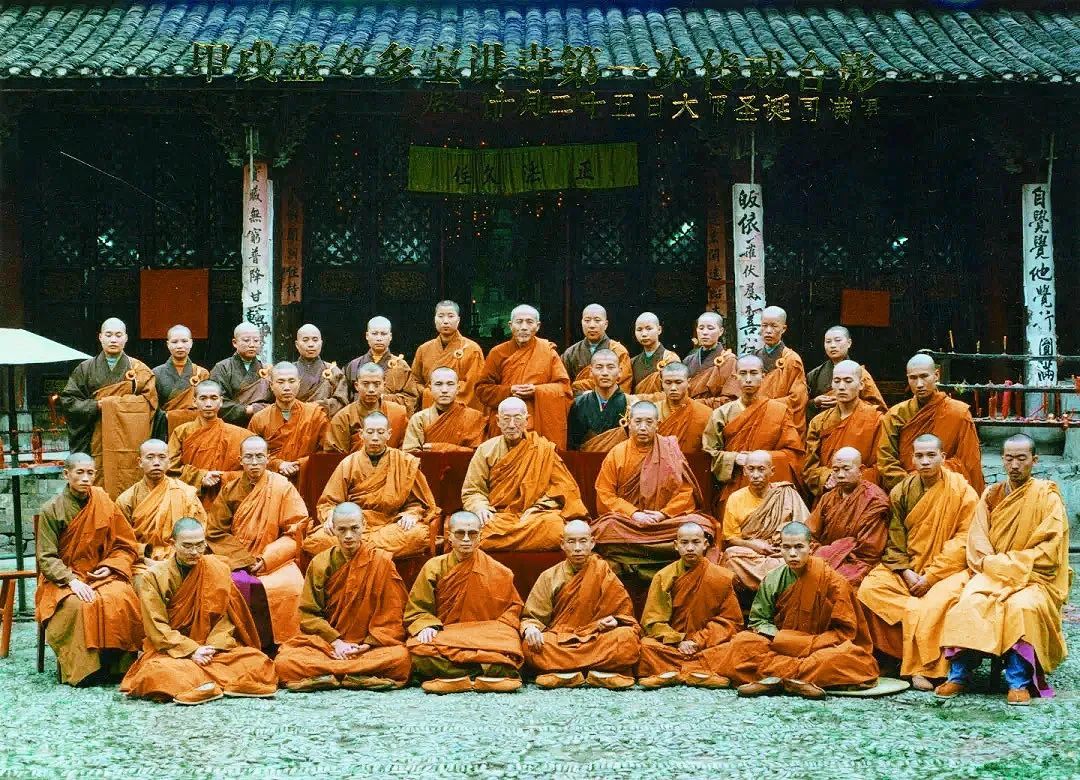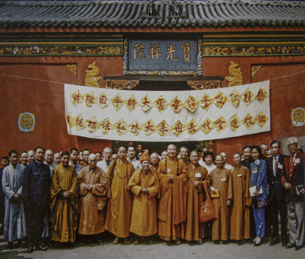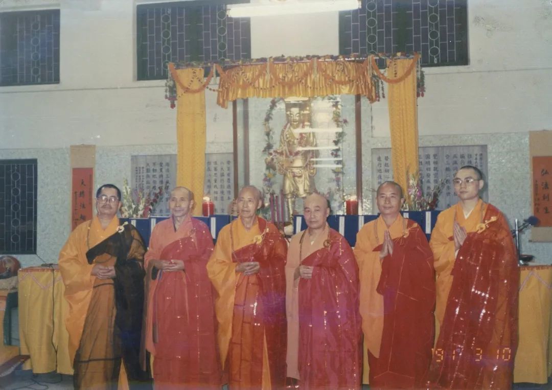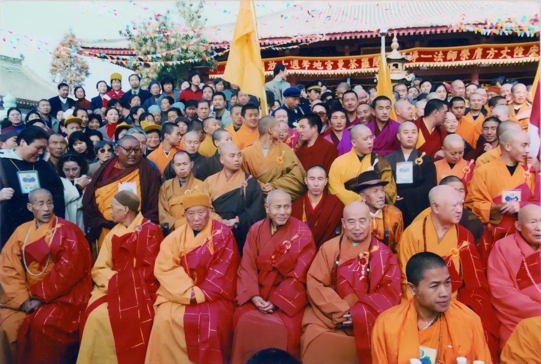 1989年,中国台湾佛光山星云大师首次回大陆探亲弘法,参访成都宝光寺(前排:净天长老左二、净慧长老左四、清定上师左五、星云大师中)