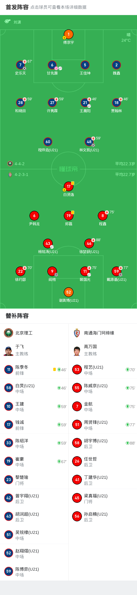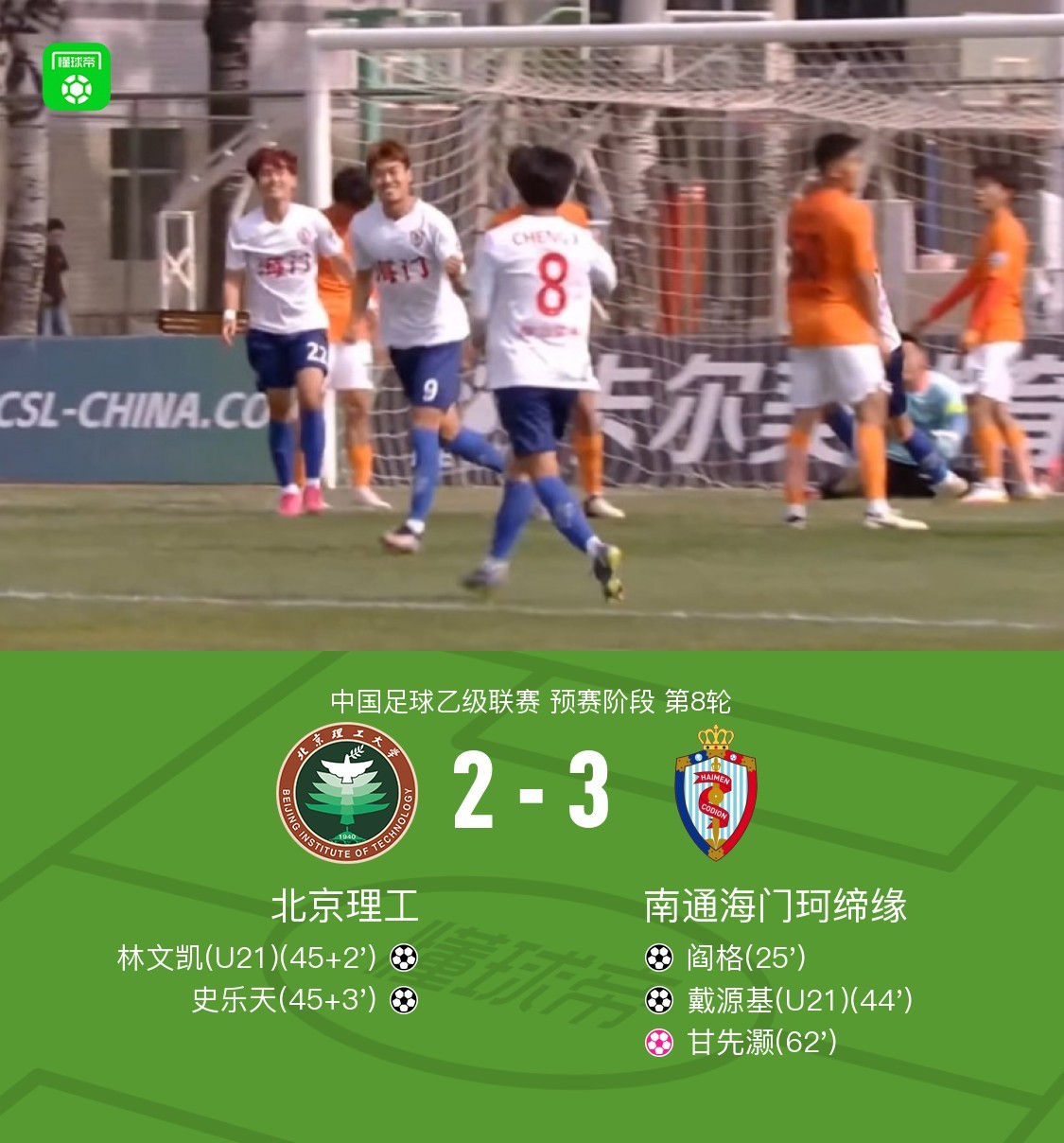 北京时间5月7日,中国足球乙级联赛预赛阶段第8轮,北京理工主场迎战南通海门珂缔缘。比赛中,南通海门珂缔缘由阎格和戴源基各入一球取得领先。北京理工在上半场补时阶段发起反击,林文凯和史乐天相继建功扳平比分。然而,甘先灏的乌龙球使得南通海门珂缔缘再次占据优势。最终,北京理工以2-3不敌南通海门珂缔缘。