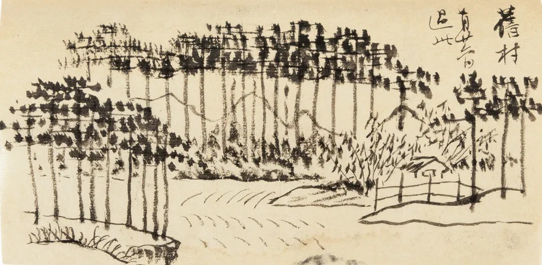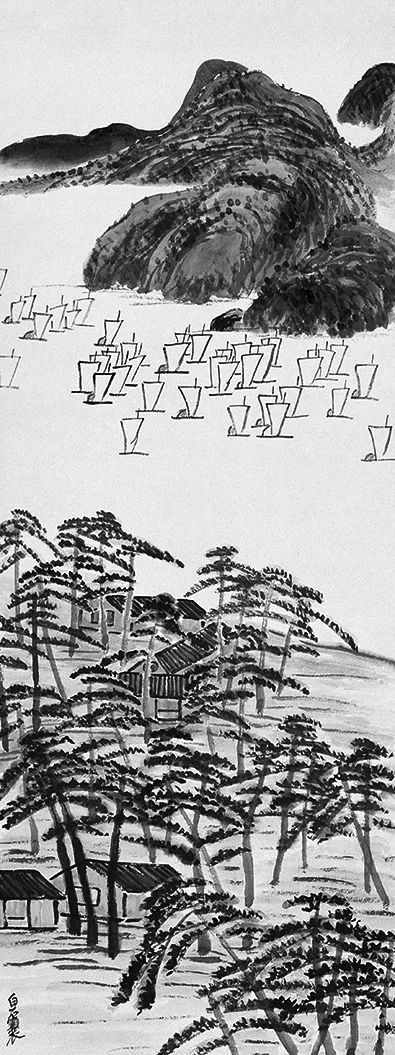 在日本大正十一年(1922)十二月廿日印刷,大正十一年十二月廿五日发行的《日华联合绘画展览会图录》中,记为“齐璜白石笔”的是一幅山水《横江扬舲》。近景是一片松林,在远山与近景中间,为一片“横江”,上有“扬舲”40余片风帆。这种壮观景象,古画中何曾见过一幅?该画应该是从其写生中得画稿。其《寄园日记》第54页12记己酉(1909)东粤之游,其中7月26日“过旧村,画图于前”就有一幅画稿,画一松林农舍,其松树画法,以横平竖直长短用笔画松林,就是白石之自创(图1)。以此为本,再添《横江扬舲》(图2),岂非一幅近景、中景、远景皆备之画?且稿本来自自然,当然前无古人了!比较除齐白石之外几乎所有的画家,自然新意盎然!齐白石绘画在日本受欢迎也理所当然。吴昌硕参展的是《墨菊》(图3)条幅,陈师曾参展的是《山茶》(图4)条幅,都是常规中国画花卉风格。