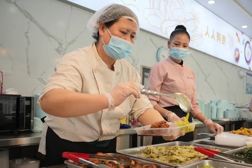 上午9点,在通达幸福里长者食堂,工作人员正忙碌有序地将热气腾腾的餐品打包。食堂提供A、B两种套餐,每份套餐均包含一大荤、一小荤、两素菜和一碗米饭,菜品设计充分考虑老人的口味偏好与营养需求,确保每日餐食营养均衡、科学搭配。