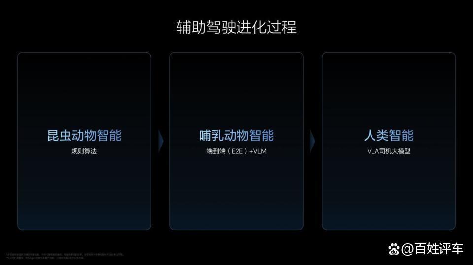 VLA的实现不是一个突变的过程,是进化的过程,经历了三个阶段,对应理想汽车辅助驾驶的昨天、今天和明天。第一阶段,理想汽车自2021年起自研依赖规则算法和高精地图的辅助驾驶,类似“昆虫动物智能”。第二阶段,理想汽车自2023年起研究,并于2024年正式推送的端到端+VLM(Vision Language Model,视觉语言模型)辅助驾驶,接近“哺乳动物智能”。