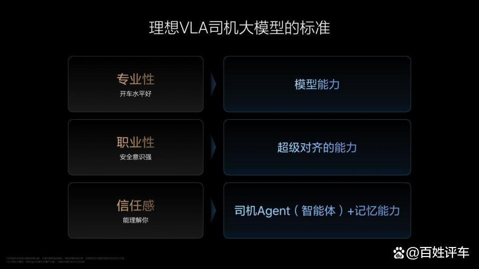 判断司机Agent是否是个好司机,有三个关键标准:专业能力、职业能力和构建信任的能力。VLA司机大模型提升了专业能力,超级对齐增强了职业能力,VLA通过理解自然语言、具备记忆能力提升了构建信任的能力。