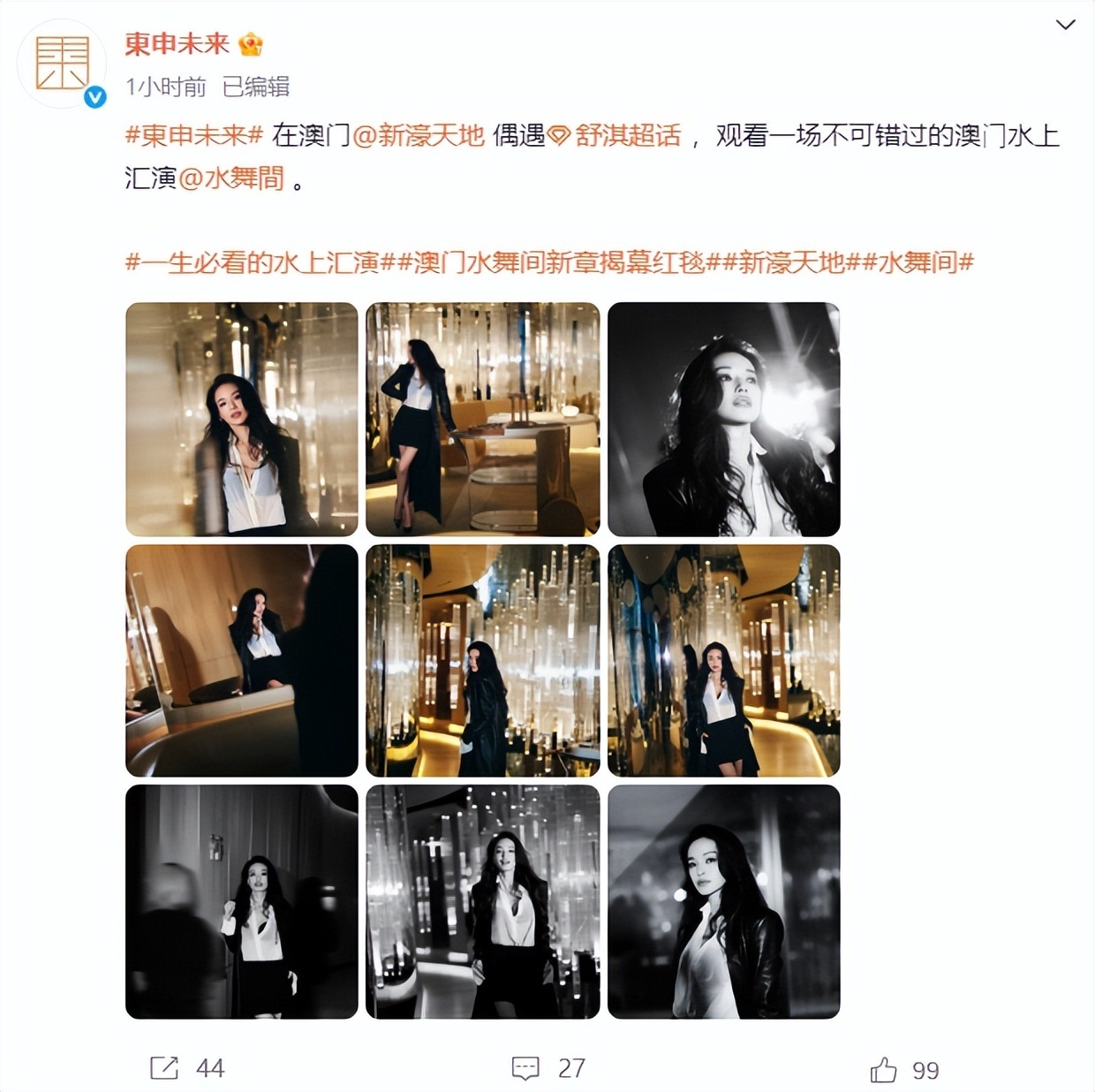 经纪公司还晒出舒淇另一套穿搭,她身穿黑色皮衣配高跟鞋,被网友点赞“好美”。