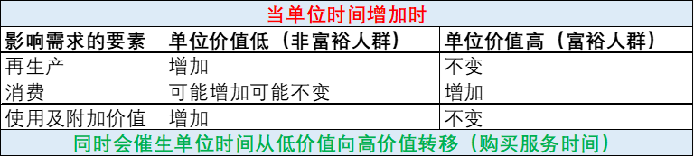 回到前文提到的狭义需求和广义需求,对于单位时间价值低的人,会极致利用单位时间的使用效率,提升产品的使用价值。并且,更多的单位时间意味着再生产的可能性提高,会带动需求向上。