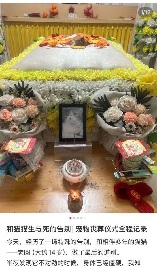 这是社交平台上,小鱼分享的与相伴14年猫咪“老圆”的一场盛大的告别仪式。
