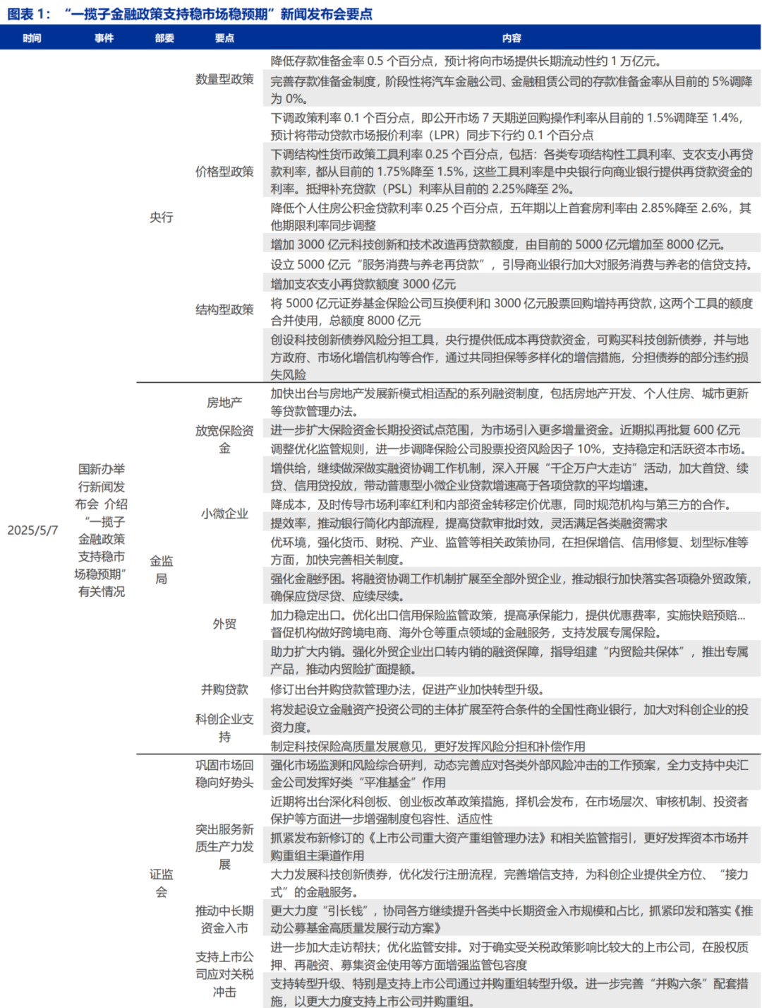 支持民营经济、科技创新发展,强有力的金融支持或是后续重点。稳就业稳经济发布会中,央行已指出将运用科技创新再贷款等工具,持续加大对科技等领域民企的信贷支持。本次发布会,金融监管总局进一步提出将推出支持民营企业融资一揽子政策,并对受关税影响较大的主体提供精准金融服务;同时,健全科技金融体制,包括建立信贷支持专项机制、制定科技保险发展意见、扩大股权投资等。