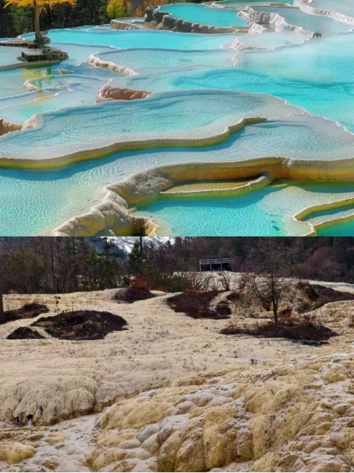 黄龙景区丰水期和枯水期对比图。图/社交平台截图