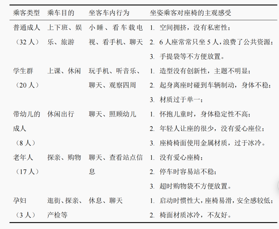 坐姿乘客观察及访谈记录汇总丨图源:参考资料[3]