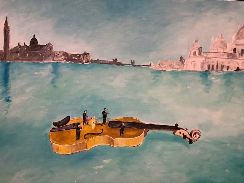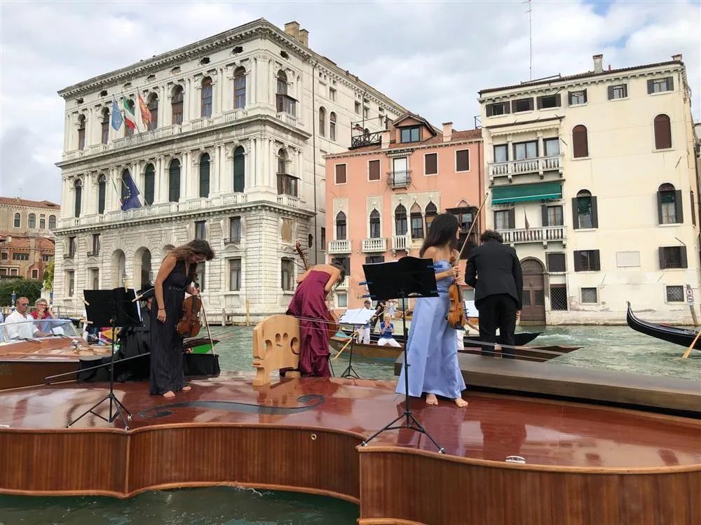 琴头化作船首,腮托上载着现场弦乐四重奏,正在演奏一场水上漂浮演奏会。
