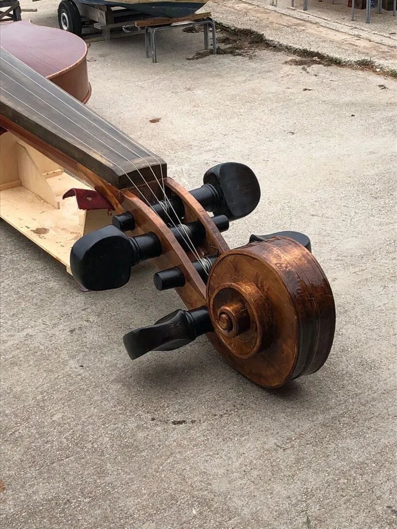这座名为“诺亚的小提琴”(Violin of Noah)的船,长12米,简直把小提琴完美复刻出来了。真是处处都是细节,像是琴头、指板、音孔、腮托等结构都完美还原。