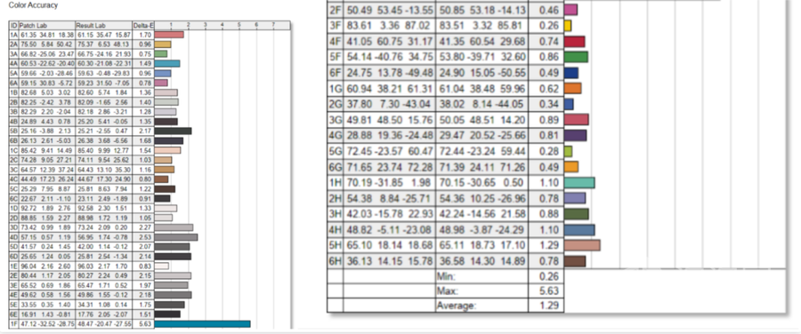 色准方面平均值为1.29,除了一种颜色较为突出外,其余色彩的精准度也是相对准确的。