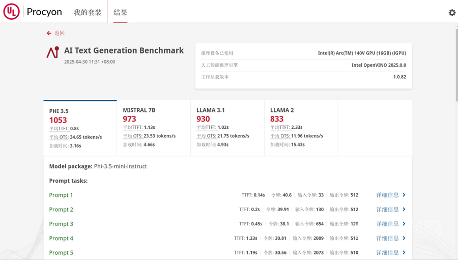 AI成为现在笔记本行业非常重要的领域,对于AI的支持也是衡量笔记本性能的指标之一。UL Procyon提供了Phi-3.5、Mistral 7B、Llama 3.1以及Llama 2四种测试,Dell Pro 14 Premium分别得分1053、973、930和833,对应AI支持也能够满足当下的使用需求。