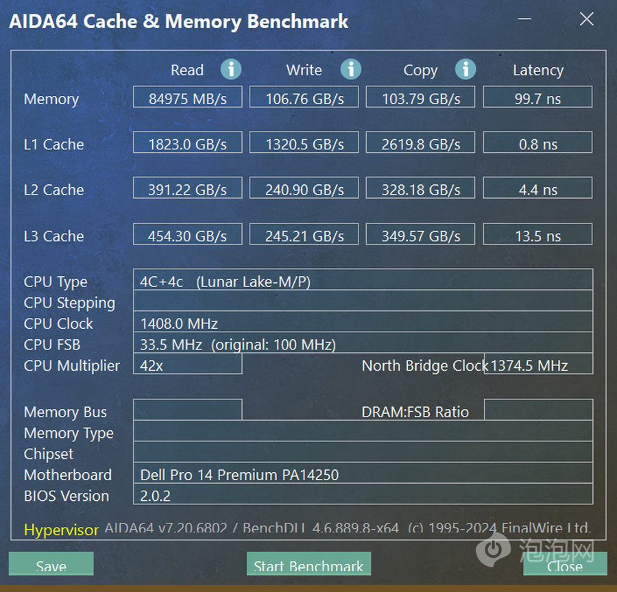 Dell Pro 14 Premium搭载了16GB LPDDR5x内存,从AIDA64测试数据来看,内存读取速度为84975 MB/s,写入速度达106.76 GB/s,复制速度为103.79 GB/s,展现出高效的数据处理能力。