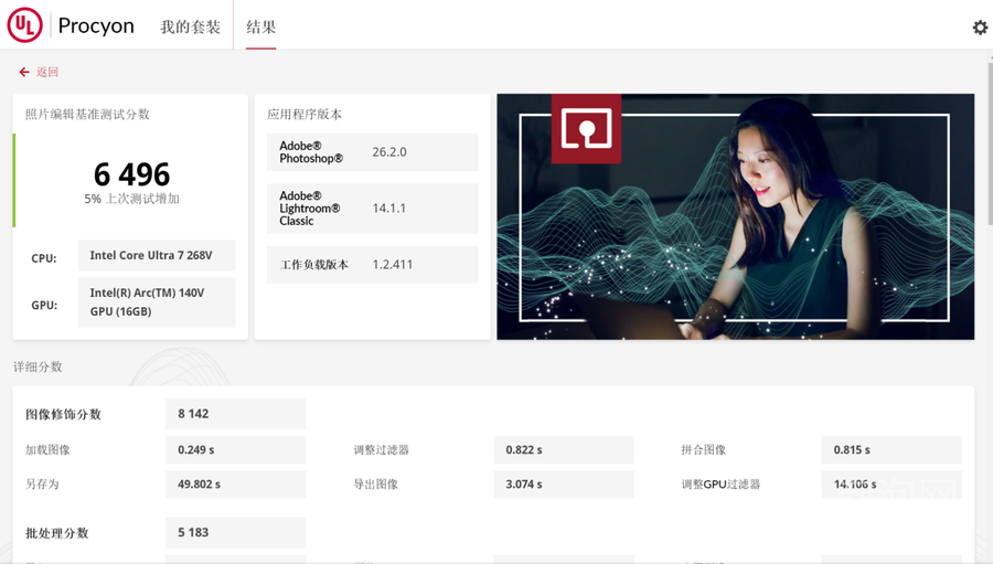 通过UL Procyon对Dell Pro 14 Premium的照片编辑能力进行测试,程序为PhotoShop和Lightroom Classic,最终成绩为6496分。