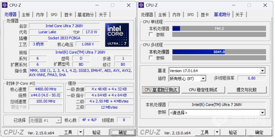 根据CPU-Z的测试数据来看,Dell Pro 14 Premium搭载的Ultra 7 268V处理器单核成绩为741.3分,多核成绩为5041分。