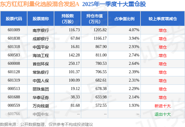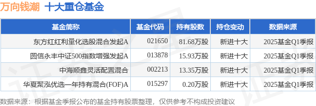 根据2025基金Q1季报公募基金重仓股数据,重仓该股的公募基金共4家,其中持有数量最多的公募基金为东方红资产管理的东方红红利量化选股混合发起A。东方红红利量化选股混合发起A目前规模为1.87亿元,最新净值0.9671(5月8日),较上一交易日下跌0.02%。该公募基金现任基金经理为徐习佳。徐习佳在任的基金产品包括:东方红中证竞争力指数A,管理时间为2019年7月31日至今,期间收益率为14.81%;东方红中证红利低波动指数A,管理时间为2021年12月30日至今,期间收益率为40.71%;东方红中证优势成长指数发起A,管理时间为2023年9月19日至今,期间收益率为19.25%;东方红量化选股混合发起A,管理时间为2024年5月21日至今,期间收益率为7.51%。
