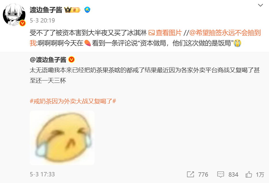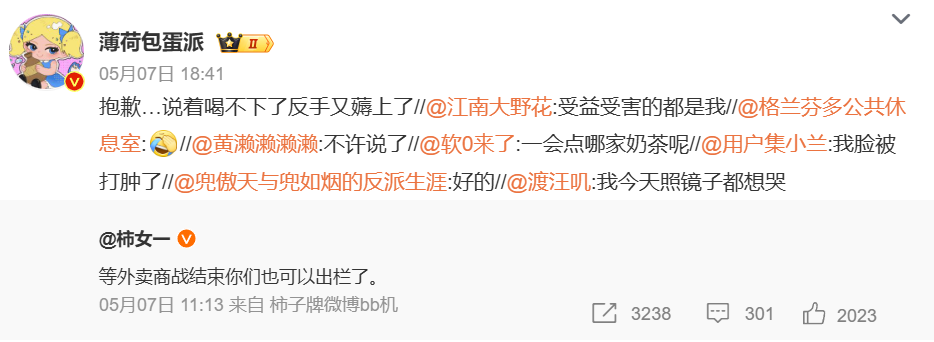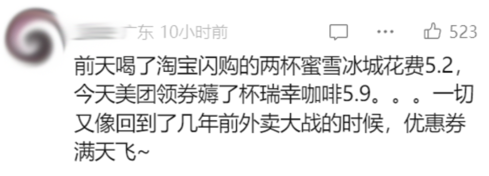 外卖商战打到现在,消费者们一边喝尽兴了,很是欣慰“奶茶终于回到了应有的价格”,一边喝委屈了,“不知道谁会赢,反正最后是我变胖”,一边又还是舍不得这种低价待遇,“胖就胖吧,你们再接着打,别停”。