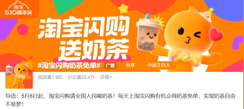 5月6日,淘宝闪购宣布联合饿了么向消费者免费送出1亿杯奶茶、咖啡等茶饮。当天起至5月10日,每天8:00、12:00、18:00开放抽卡,在淘宝闪购频道搜索“奶茶免单”,就有机会获得“免单卡”和“请客卡”。