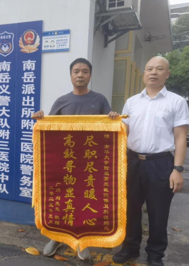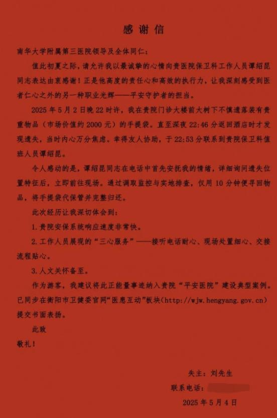 2025年5月2日晚22时许,来衡游客刘先生在我院门诊大楼前不慎遗落装有贵重物品(市场价值约2000元)的手提袋,直至22时46分返回酒店后方才察觉。焦急万分的刘先生通过友人协助,于22时53分联系到当晚值班的谭绍昆。