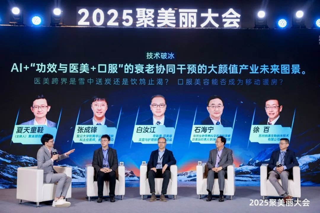 围绕AI+“功效与医美+口服”的衰老协同干预的大颜值产业未来图景,在聚美丽创始合伙人兼总编辑@夏天童鞋的主持下,复旦大学附属华山医院皮肤科主任医师教授/博导张成锋,帝斯曼-芬美意美容与护理部门技术总监白汝江,华熙生物营养科学首席科学家、原美国哈佛大学/麻州总院教授石海宁博士,苏州纳通生物纳米技术有限公司董事长徐百,以各自不同领域的认知,针对医美跨界是雪中送炭还是饮鸩止渴,口服美容能否成为移动暖房等系列问题,进行了一场思维碰撞。