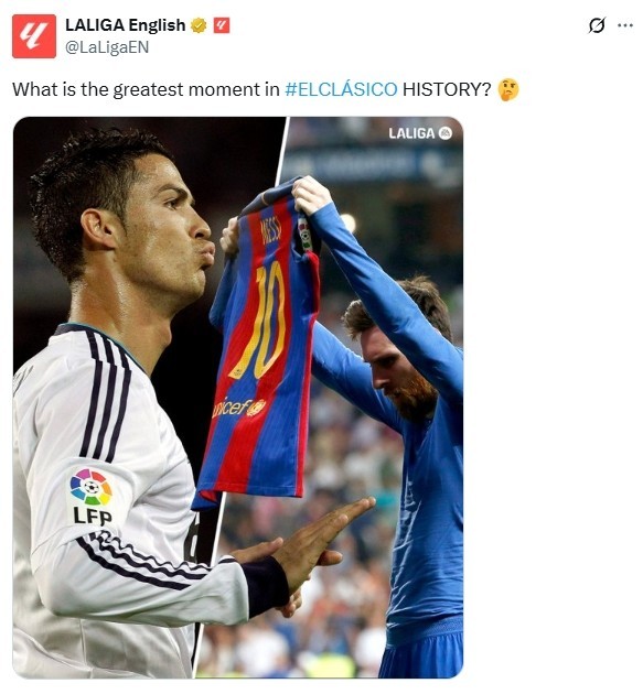 北京时间5月11日晚,24-25赛季西甲第35轮迎来一场重量级较量,巴萨主场迎战皇马。赛前,西甲官方晒出了C罗的诺坎普安静以及梅西的伯纳乌晾球衣两个世纪名画。并配文:“哪个是国家德比最佳瞬间?”