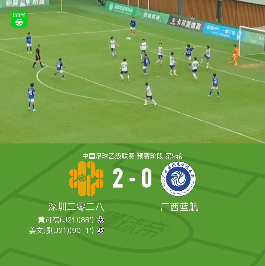 北京时间5月10日,中国足球乙级联赛预赛阶段第9轮,深圳二零二八主场迎战广西蓝航。比赛中,深圳二零二八凭借黄可祺的进球取得领先,随后姜文璟再入一球锁定胜局。最终,深圳二零二八以2-0战胜广西蓝航。