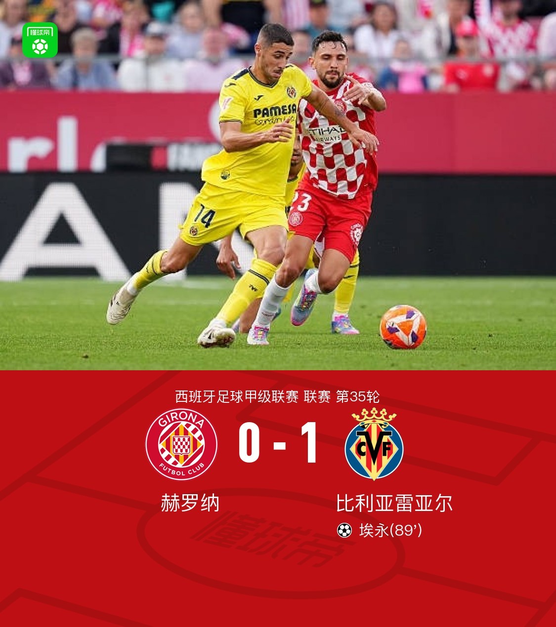 北京时间5月11日西班牙足球甲级联赛 联赛 第35轮,赫罗纳主场对阵比利亚雷亚尔。比利亚雷亚尔埃永破门。最终比分赫罗纳 0-1 比利亚雷亚尔。