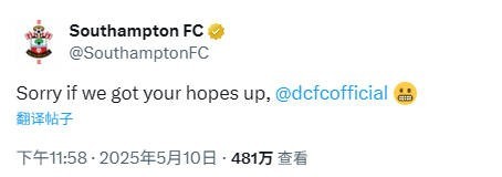 赛后,南安普顿官方在社交媒体上发表动态,调侃了自己的成绩:“很抱歉让你们失望了,德比郡。”