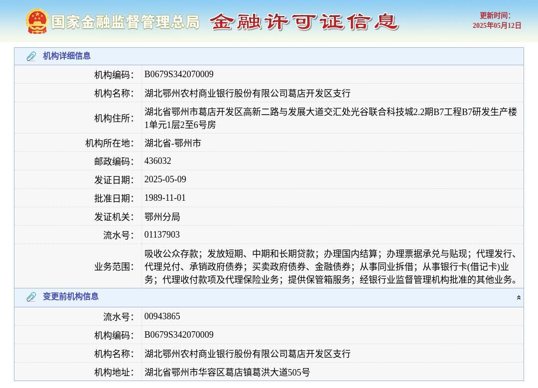 5月12日,根据国家金融监管总局许可证信息查询平台,湖北鄂州农村商业银行股份有限公司葛店开发区支行换发金融许可证,发证日期2025年5月9日。