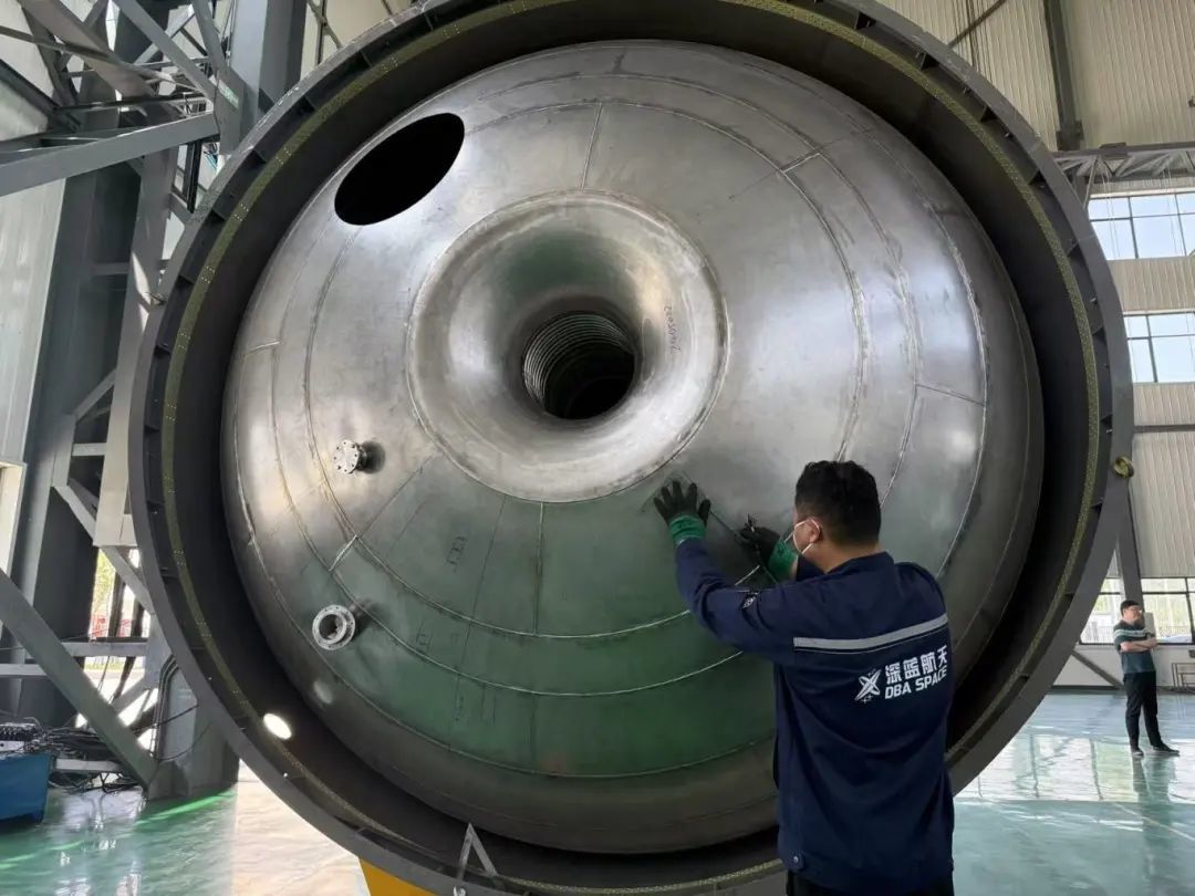 深蓝航天厂房内,技术人员正在对燃料贮箱进行焊接点标注