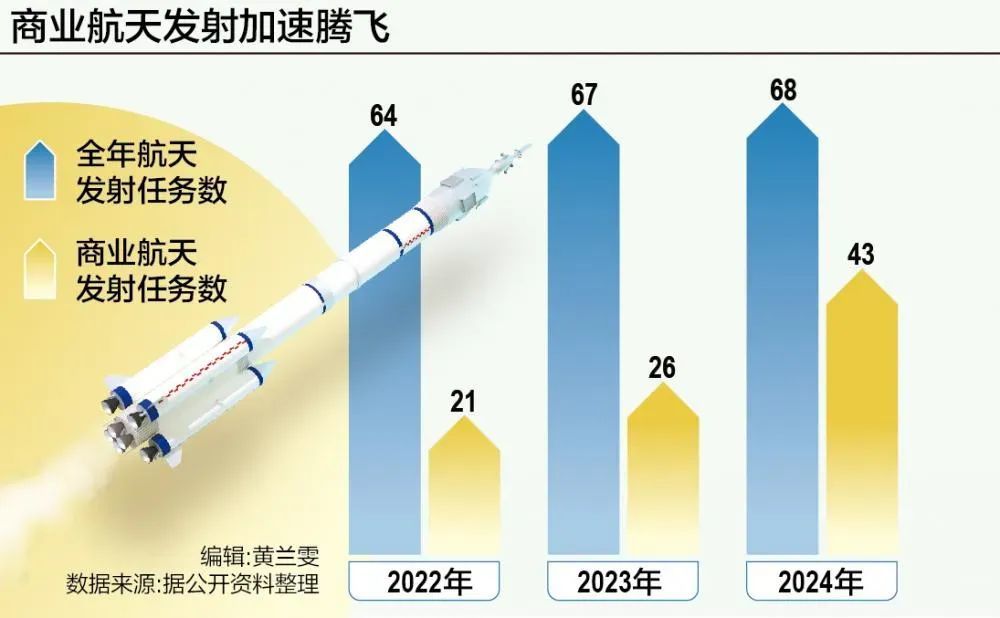 去年,中国共完成68次航天发射任务。其中,商业航天发射43次,占比超过60%,创下历史新高。