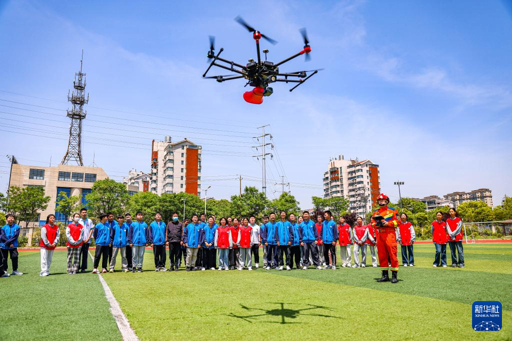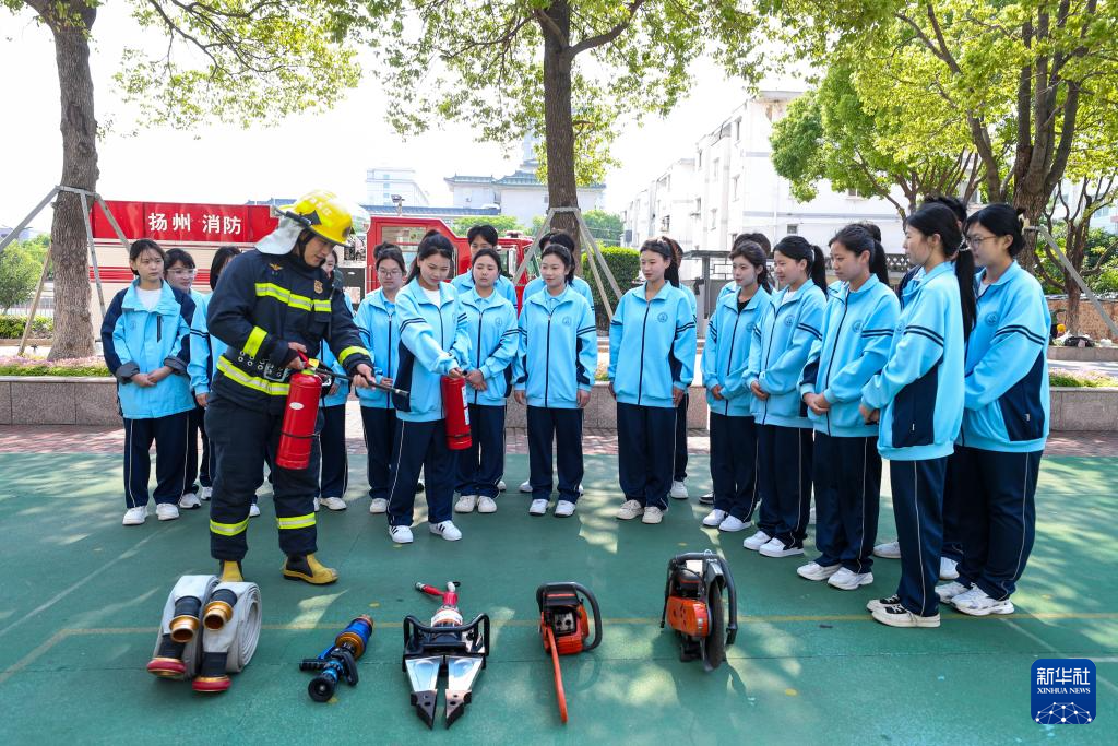 5月12日,在江苏省扬州市江都区第二中学,扬州市江都区消防救援大队消防员给学生演示消防职业技能。