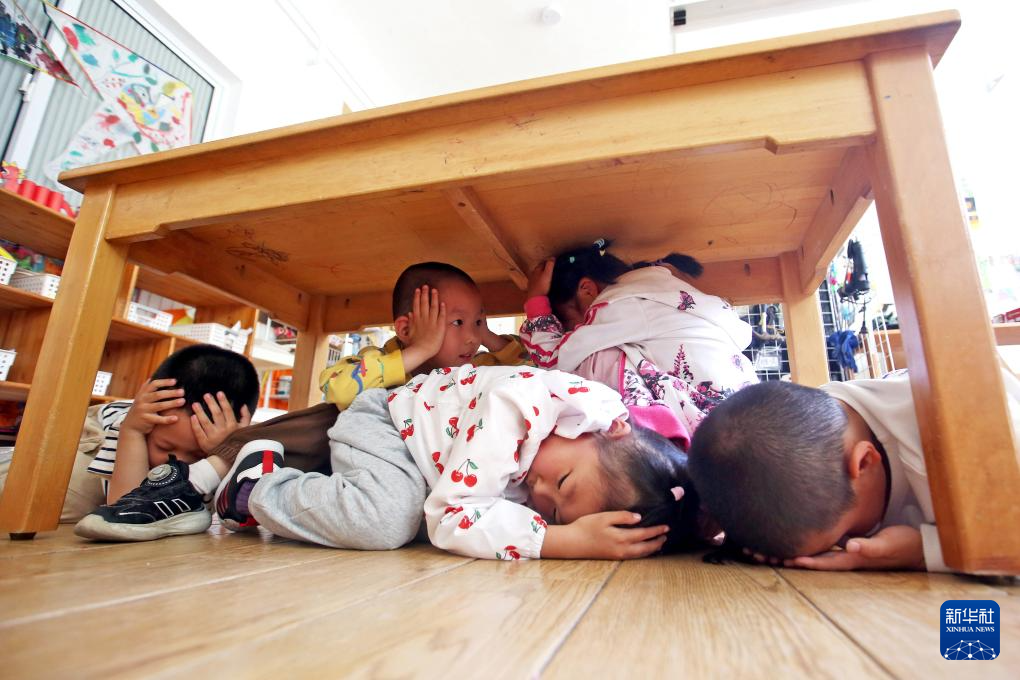 5月12日,小朋友们在学习模拟地震来临时的避险要领。
