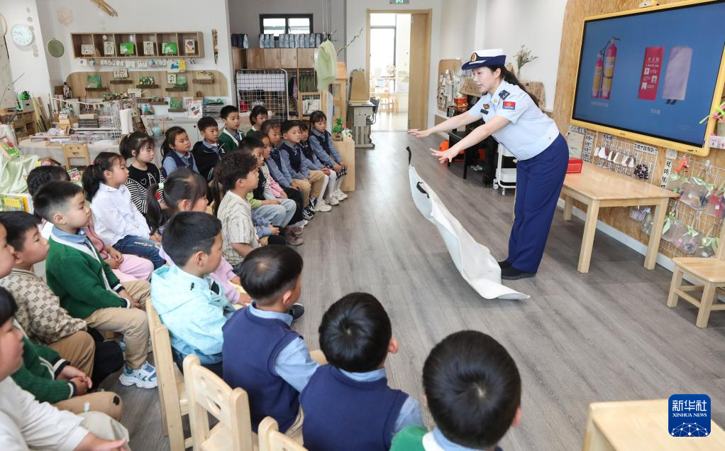 5月12日,江苏淮安生态文旅区消防救援大队消防员为幼儿园小朋友讲解防灾减灾知识。