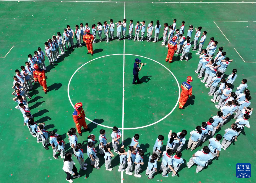 5月12日,武汉市未来实验小学美林校区小学生进行躲避地震逃生演练(无人机照片)。