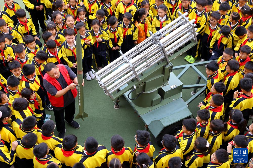 5月12日,在山东省枣庄市市中区文化路小学,当地气象台的志愿者在向学生们宣传气象防灾减灾科普知识。