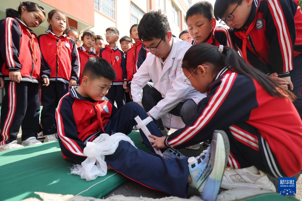 5月12日,在山东省临沂市沂南县鲁家庄中心小学,沂南县第二医疗健康服务集团铜井院区的医生为小学生们讲解骨折急救处理方法。
