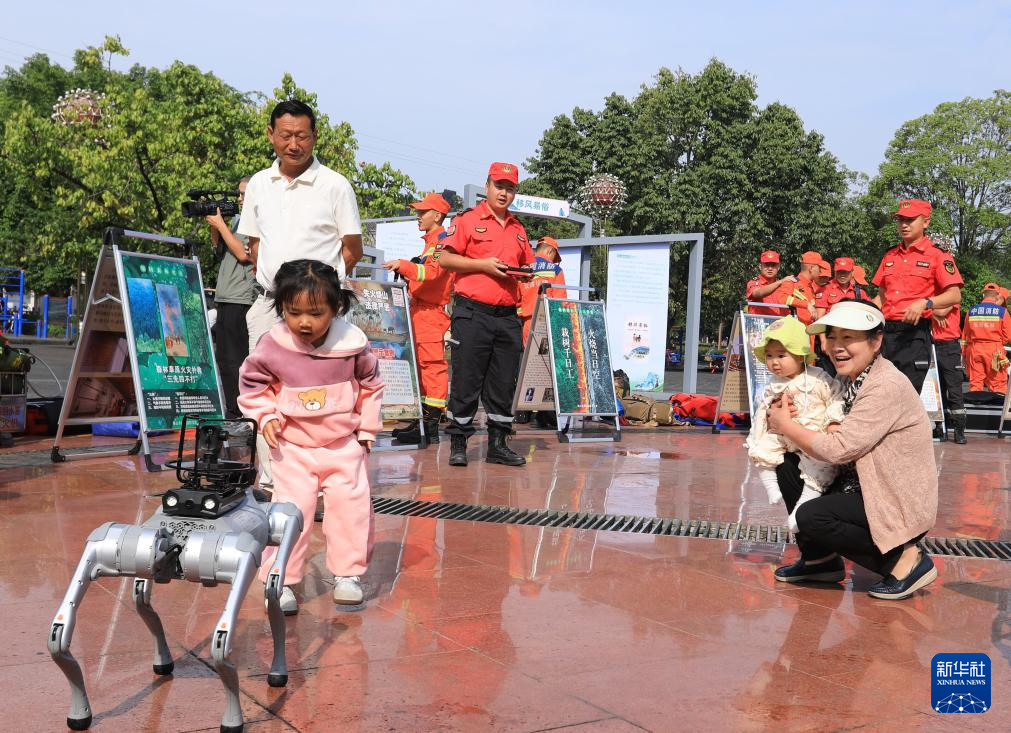 5月12日,在云南省腾冲市防灾减灾主题宣传教育活动现场,市民和救援机器狗互动。