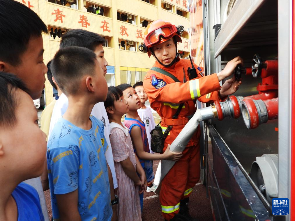 5月12日,四川达州市森林防灭火应急救援支队消防员为学生讲解消防设备。