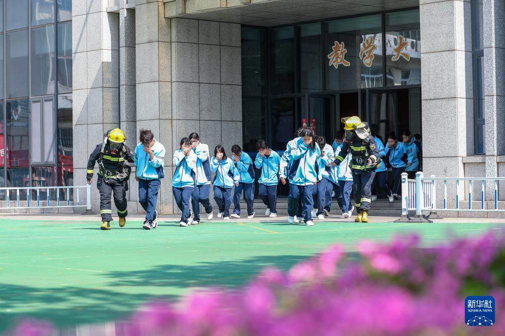5月12日,在江苏省扬州生活科技学校,学生在扬州市邗江区消防救援大队消防员带领下进行逃生疏散演习。