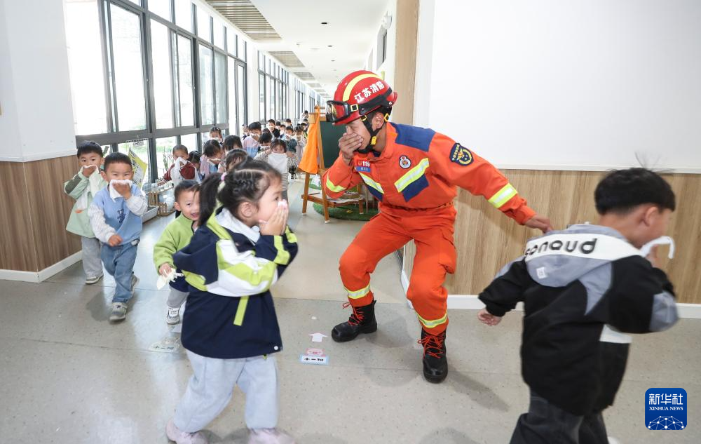 5月12日,江苏淮安生态文旅区消防救援大队走进辖区文锦苑幼儿园,开展“防灾减灾 安全‘童’行”消防逃生演练活动。